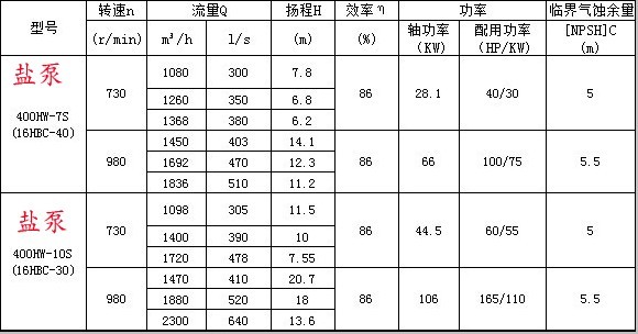 400HW混流泵的性能參數(shù) |